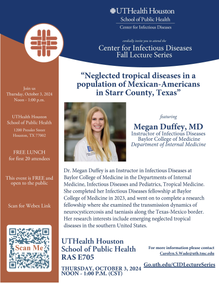 Join us for the Center for Infectious Diseases Fall Lecture with guest speaker Megan Duffey, MD. Duffey will present her lecture titled "Neglected tropical diseases in a population of Mexican-Americans in Starr County, Texas." Free lunch to the first 20 attendees. Virtual Link is available below.