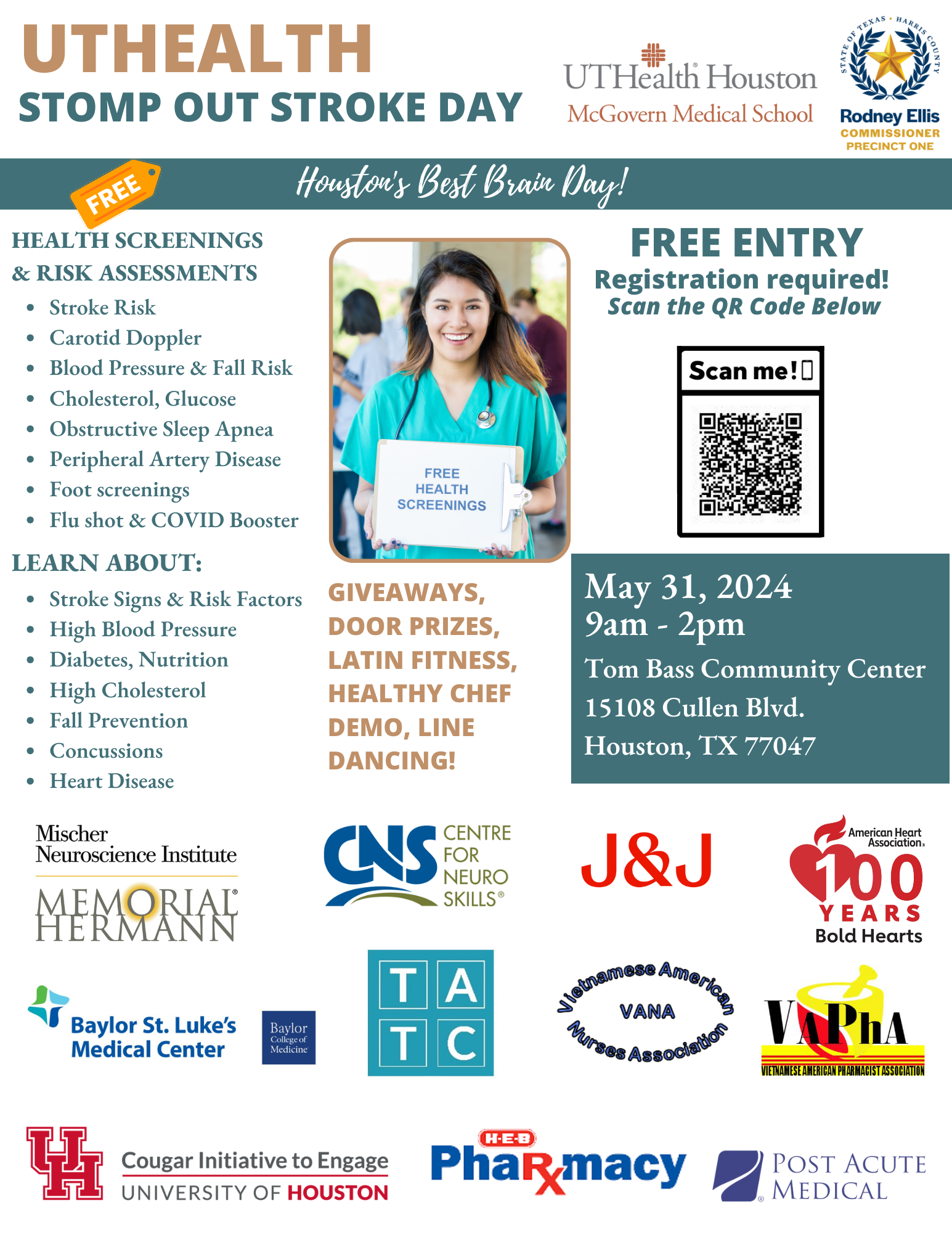 Stomp Out Stroke Day 2024 When & Where May 31, 2024 9:00 AM - 2:00 PM Tom Bass Community Center 15108 Cullen Blvd. Houston, TX 77047 ( View in Google Map) Contact Elizabeth Noser [email protected] Event Description
