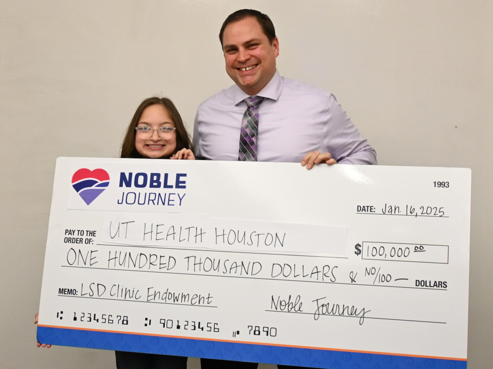 Grateful patient Rylee Noble (left) presents a check on behalf of her family to support the Lysosomal Storage Disease Clinic at UTHealth Houston, led by clinic director Paul Hillman, MD, PhD (right).