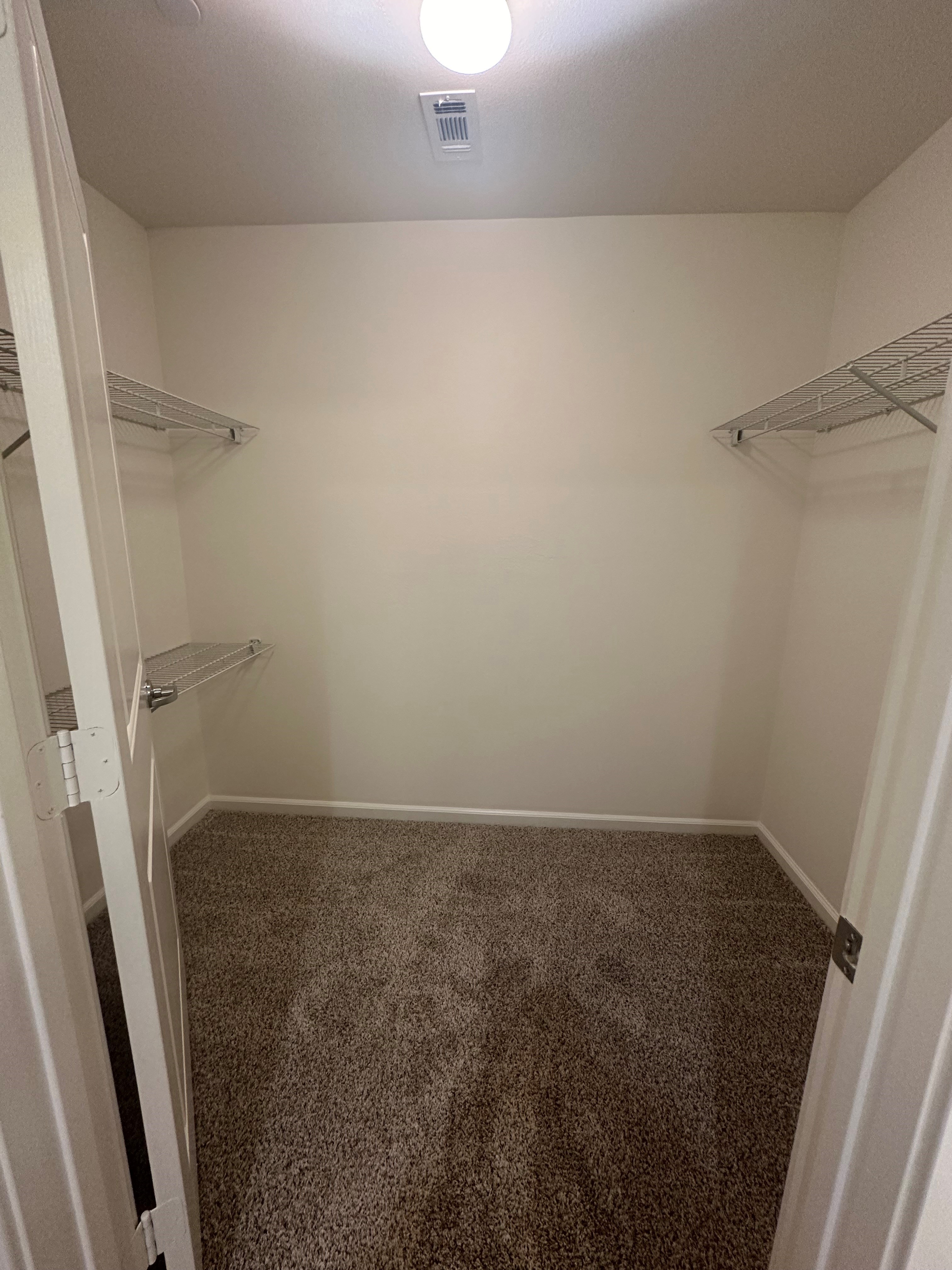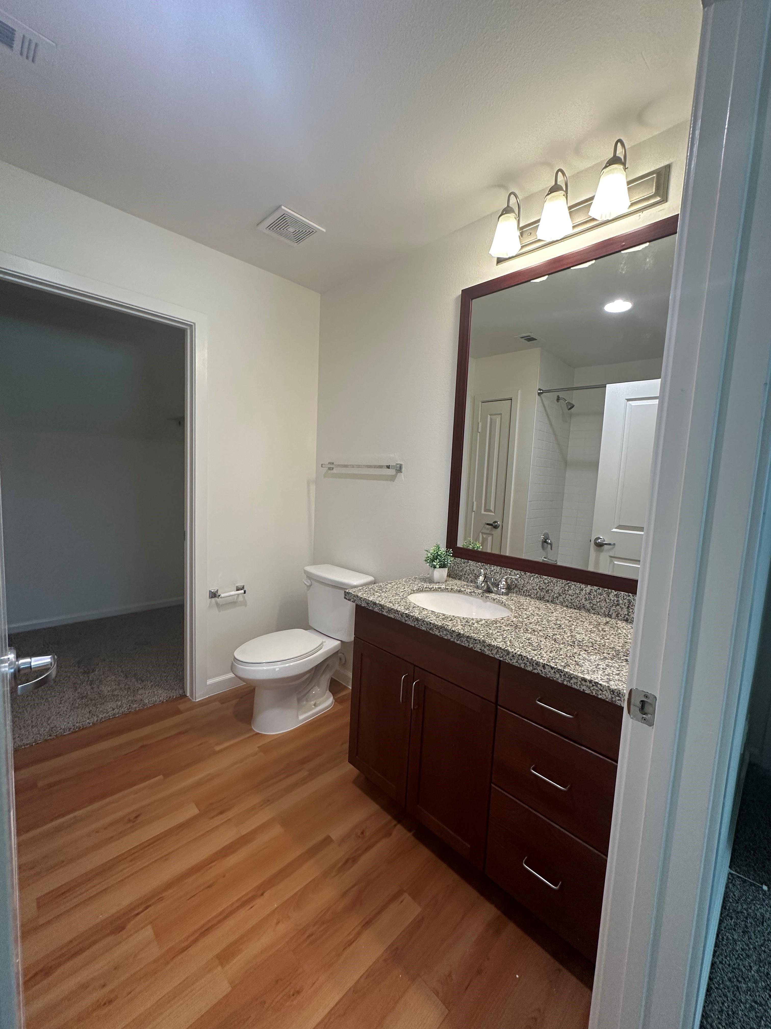 University Housing - Phase Three - Bathroom + Closet View - Phase Three apartments at UTHealth Houston University Housing feature upgraded bathrooms with granite countertops, modern cabinetry, and adjacent closet space for added convenience.