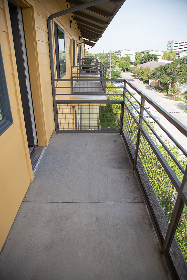 University Housing - Phase Three - Balcony View - Phase Three apartments at UTHealth Houston University Housing feature private balconies, offering residents outdoor living space with views of landscaped grounds.