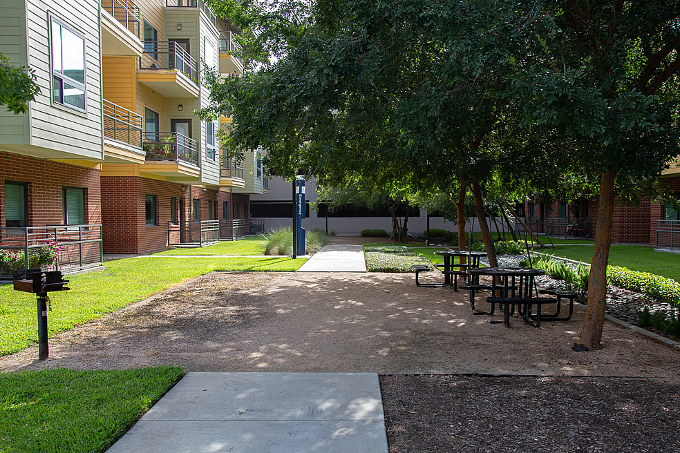 University Housing - Phase Three - Apartment Courtyard Grounds - Phase Three living means more than just your apartment — step outside to enjoy green spaces, shaded picnic spots, and a welcoming community right at your doorstep.