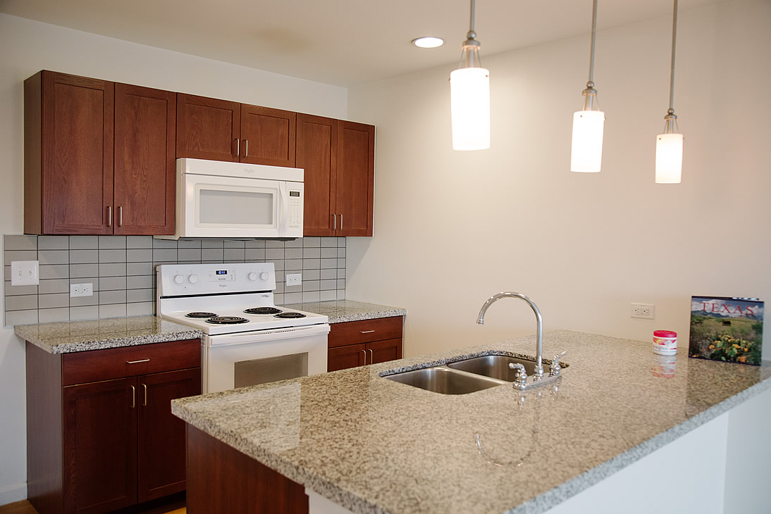 University Housing - Phase Three - Kitchen - Phase Three kitchens at UTHealth Houston University Housing feature upgraded finishes, granite countertops, and modern lighting for a contemporary living experience.