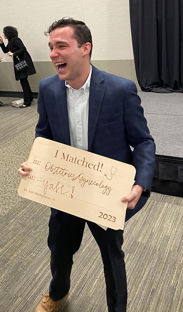 John Biebighauser, 25, always knew he wanted a career in medicine. After high school, John attended Texas Christian University where he obtained a degree in neuroscience and hoped to follow that path at McGovern Medical School. However, a rotation in obstetrics and gynecology made him realize he was meant to change directions. As the only brother in a set of triplets born through in vitro fertilization (IVF), John will be the first physician in his family, becoming the same kind of doctor that helped bring him into this world. To John, this is a full circle moment. “In retrospect, it’s the perfect fit,” John said. “I was an IVF baby, and the stories I heard growing up about the experiences my parents had with fertility care stuck with me. To me, OBGYN is the best field – I will get to see patients in clinic, operate on them, deliver babies, and it’s an opportunity to care for a patient from birth to graveside. It’s everything I wanted.” During his four years at McGovern Medical School, John served as class president, helping plan class events and volunteer opportunities, and even served on the student senate committee. “It’s been fun being able to serve as a representative for my fellow classmates. It’s been cool to see two different perspectives, one as a medical student, and I also get to see how things go in the background with the administration side of things,” John said. He credits mentors Rachel Jantea, MD, assistant professor of geriatrics and palliative care, and Elizabeth Nugent, MD, associate professor of obstetrics, gynecology and reproductive sciences, for their enduring support throughout his journey at McGovern Medical School. John discovered today that he matched to Yale New Haven Hospital School of Medicine. “I am in awe of what just happened,” he said. “I cannot believe I matched to Yale. I could not be more excited. It’s going to be an incredible place to learn and the support will be tremendous.”