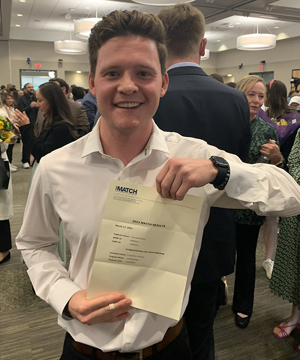 Liam Murphy, 26, arrived into the world as a blessing of modern medicine. His mother Julie, who had cystic fibrosis, couldn’t carry children because of the burden on her already-scarred lungs. So, through in vitro fertilization, his aunt carried Julie’s triplets, including Liam. Sadly, even after a lung transplant, Julie died when the triplets were 3. Two years later, his father, John, married Bari Murphy, who received her undergraduate degree from The University of Texas at Austin and her master’s degree from the University of Houston, both in psychology. She instilled into Liam, who was born in Glen Ellyn, Illinois, a lifelong love for the Texas Longhorns and inspired him to attend UT Austin, where he received a bachelor’s degree in psychology. Liam spent a gap year receiving a master’s degree in physiology from Georgetown University and then found himself following in Bari’s footsteps to Houston, selecting McGovern Medical School because of its welcoming atmosphere and collaborative attitude, he said. He has been active as a member of the McGovern Medical School Student Committee on Professionalism and Ethics, and is co-president of Student Ambassadors. Because he has always enjoyed working with children – he was a youth soccer referee and baseball umpire – Liam initially thought he wanted to do pediatric surgery. “But the surgeon life was not for me,” Liam said. “I thought about general pediatrics, but I felt like something was missing, and then I took an elective in pediatric anesthesiology. By the second day, I knew that was what I wanted to do after I watched the attending work with a 6-year-old, talking to her and helping her pick out a flavor for her mask.” He will take the next step in his career at the University of Southern California. “I was shaking and couldn’t get the envelope open,” Liam said. “I am really happy. USC was one of my top choices so I was thrilled to end up there. I think it’s going to be a good next four years.” His mentors at McGovern Medical School were Sandra McKay, MD, associate professor of pediatrics (he is a co-author on several of her papers about child health and gun violence), and Lauren Brollier, MD, assistant professor of anesthesiology. Eventually, he said, he might want to become a transplant anesthesiologist, helping others undergoing surgery as his mom once did. “That would be full circle for me,” Liam said.