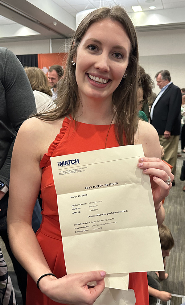 Becoming a physician-scientist was a goal Whitney Franklin, PhD, 31, didn’t fully realize she wanted until after earning a PhD in neuroscience from the University of Texas Medical Branch in Galveston. Although Whitney, who had previously received her bachelor’s degree in biochemistry from The University of Texas at Austin, loved research, she longed for a closer connection to patients, leading her to pursue an MD at McGovern Medical School. Despite her rigorous schedule, Whitney enjoyed seeing medical school through the eyes of her two children, who played with her stethoscope as she practiced exams on them. “Parenthood just enhances your medical training,” said Whitney, who has a 4-year-old son, Logan, and 1-year-old daughter, Avery, with her husband, Jimmy Sethna. “When you have kids, there isn’t an option to fail; you have to make it work. My children motivate me to do well.” Whitney’s children also motivated her to co-found Parents of McGovern, a student organization dedicated to connecting fellow student-parents with resources ranging from lactation rooms to information about maternity leave, along with other resources Whitney sought when she was pregnant with her daughter during her second year. Additionally, Whitney’s maternal experience has come in handy during her clinical rotations, particularly in her preferred specialty of pediatric neurology. “For parents whose child is battling a neurological disease, it’s very emotional, and I can empathize with their situations. Especially when I see kids who are the same ages as mine – it’s so easy for them to be my kid, which has helped guide my interactions with parents.” She credits Mary Kay Koenig, MD, director of the Center for the Treatment of Pediatric Neurodegenerative Disease at UTHealth Houston, as an invaluable mentor throughout her time in medical school due to Koenig’s ability to seamlessly balance her research and clinical work – an equilibrium Whitney also hopes to strike in her career. She takes that next step at Baylor College of Medicine. “I am beyond happy to match at Baylor into their child neurology/neuroscience program that is for MD/PhD students,” she said. “It is still a five-year program but allows me one year of research time. It is absolutely perfect for what I am wanting for my career as a physician-scientist. Plus, all of my family, husband, and in-laws are so thrilled and relieved to keep us in Houston, so that is a huge bonus.”
