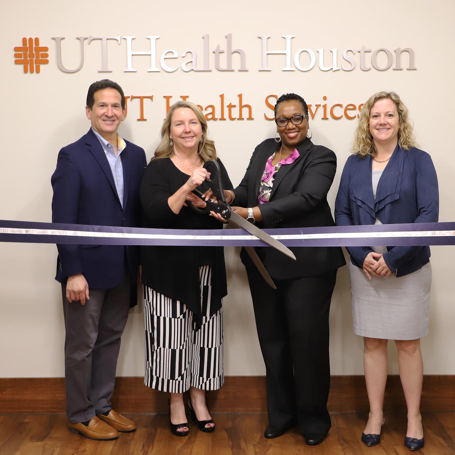 Cutting the ceremonial ribbon are Chief Operating Officer of UT Physicians Andrew Casas, Associate Dean for Practice and Community Outreach Leissa Roberts, UT Health Services Director Joy Harrison, and Cizik School of Nursing Dean Diane Santa Maria.