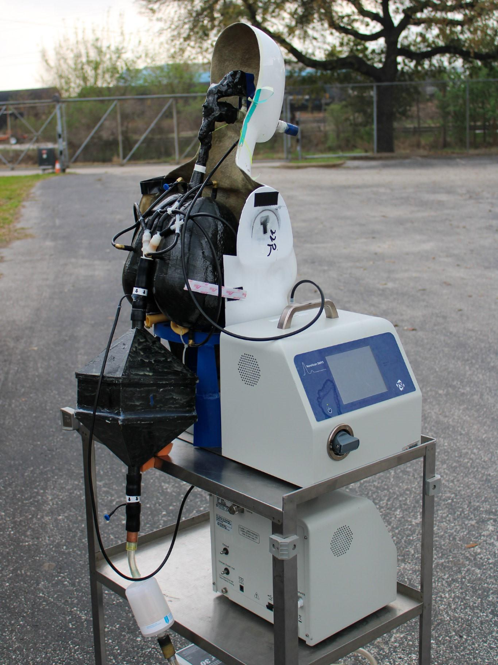 The cutting-edge Mobile Aerosol Deposition Apparatus (MALDA), designed and 3D-printed by Wei-Chung Su, PhD, assistant professor of epidemiology, human genetics, and environmental sciences, consists of a head airway, tracheobronchial airways, and a representative section of the alveoli, the tiny air sacs of the lungs that handle gaseous exchange. The system is paired with two particle sizers that measure the particle size distribution of the aerosol of concern in human airways to study lung depositions of the harmful aerosol present in the community or workplace air.