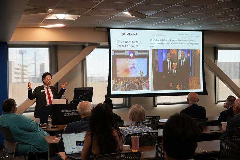 D. Bradley McWilliams Chair Hongfang Liu, PhD, professor and vice president of Learning Health System at UTHealth Houston, explored the research taking place at her Center for Translational AI Excellence and Applications in Medicine (TEAM-AI). Liu highlighted the center’s R.A.C.E. mission which focuses on revolutionizing healthcare AI, advancing data science, collaborating to accelerate scientific discovery and delivery, and excel in creating the care of tomorrow.