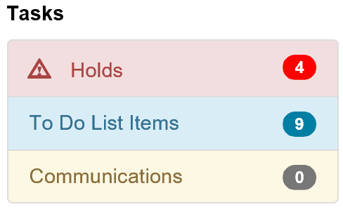 You can now find the Holds, To Do List Items and Communications all within the “Tasks” tile in the upper left-hand corner of your Home page.