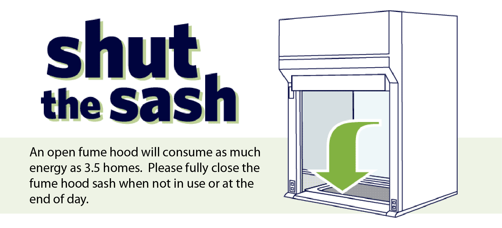 - Closing the fume hood sash helps to reduce the amount of air exhausted out of the building, therefore reducing the amount of air that must be conditioned within the lab space by the building’s HVAC system.